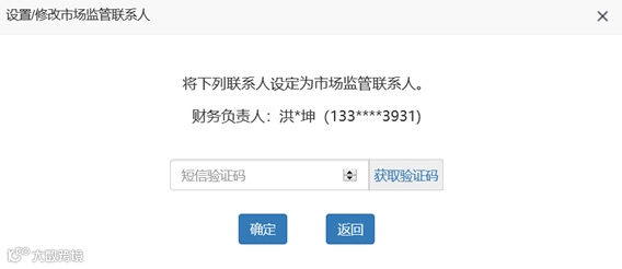 第四步:输入收到的验证码,点击“确定”,完成市场监管联系人设置!