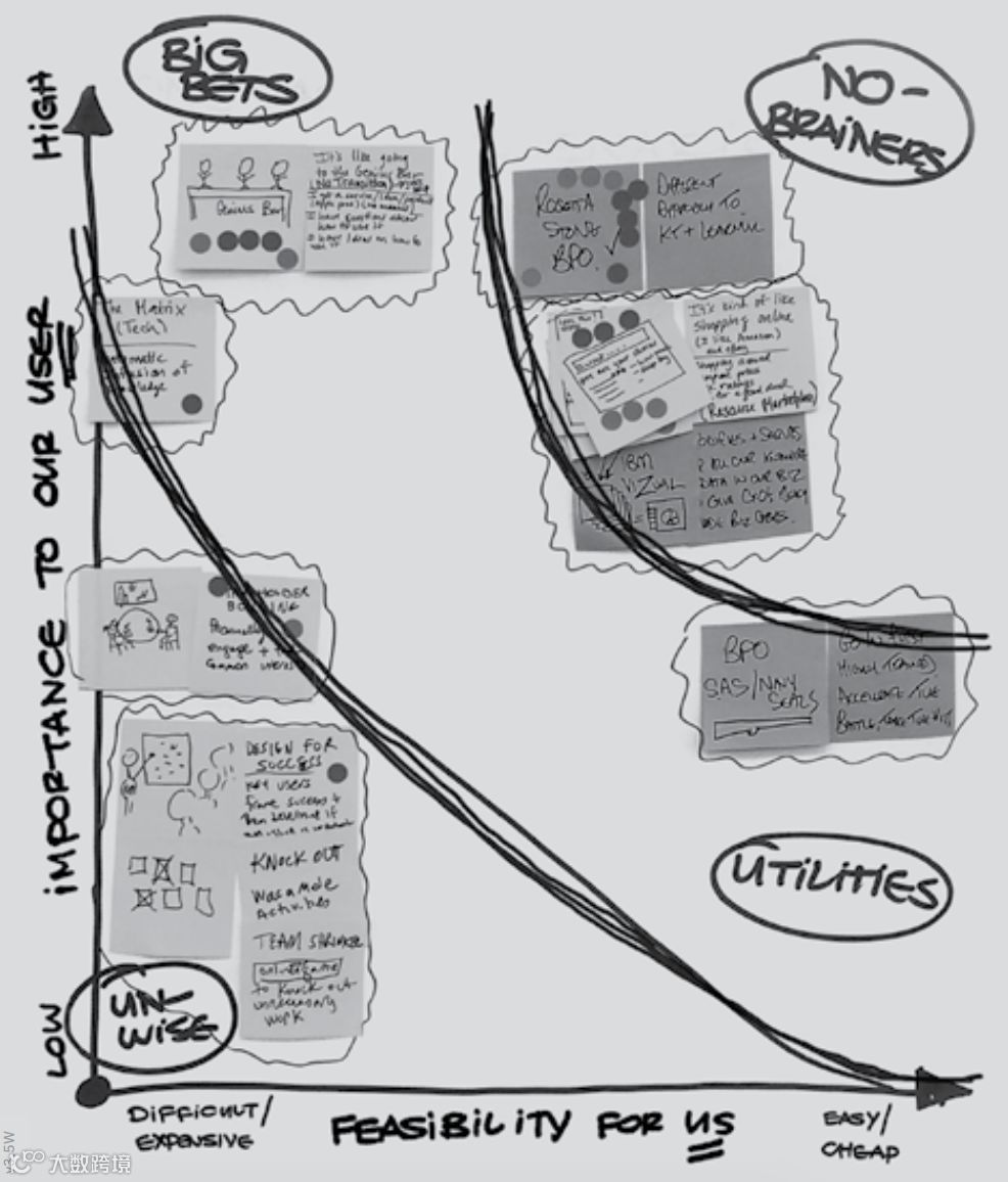 做出你的解决方案,落实到课件的东西上。可以是软件,可以是模型、纸,甚至橡皮泥,只要能展现出你的想法即可。例如,将离散的点子、想法以及创新的慨念利用绘画等直观的视觉艺术加以实现,让大家更加直观充分保持在同一个频道。可以将大家的点子用便签纸贴在黑板上,更加便于分类和定位,用最短的时间和花销来做出解决方案。通过制作原型(Prototype) 甚至利用可用性原型模拟测试法(Pretotype),通过一个具体的呈现,让思考更为明确,同时反思出现过的问题在完善原型的过程中加以改进。