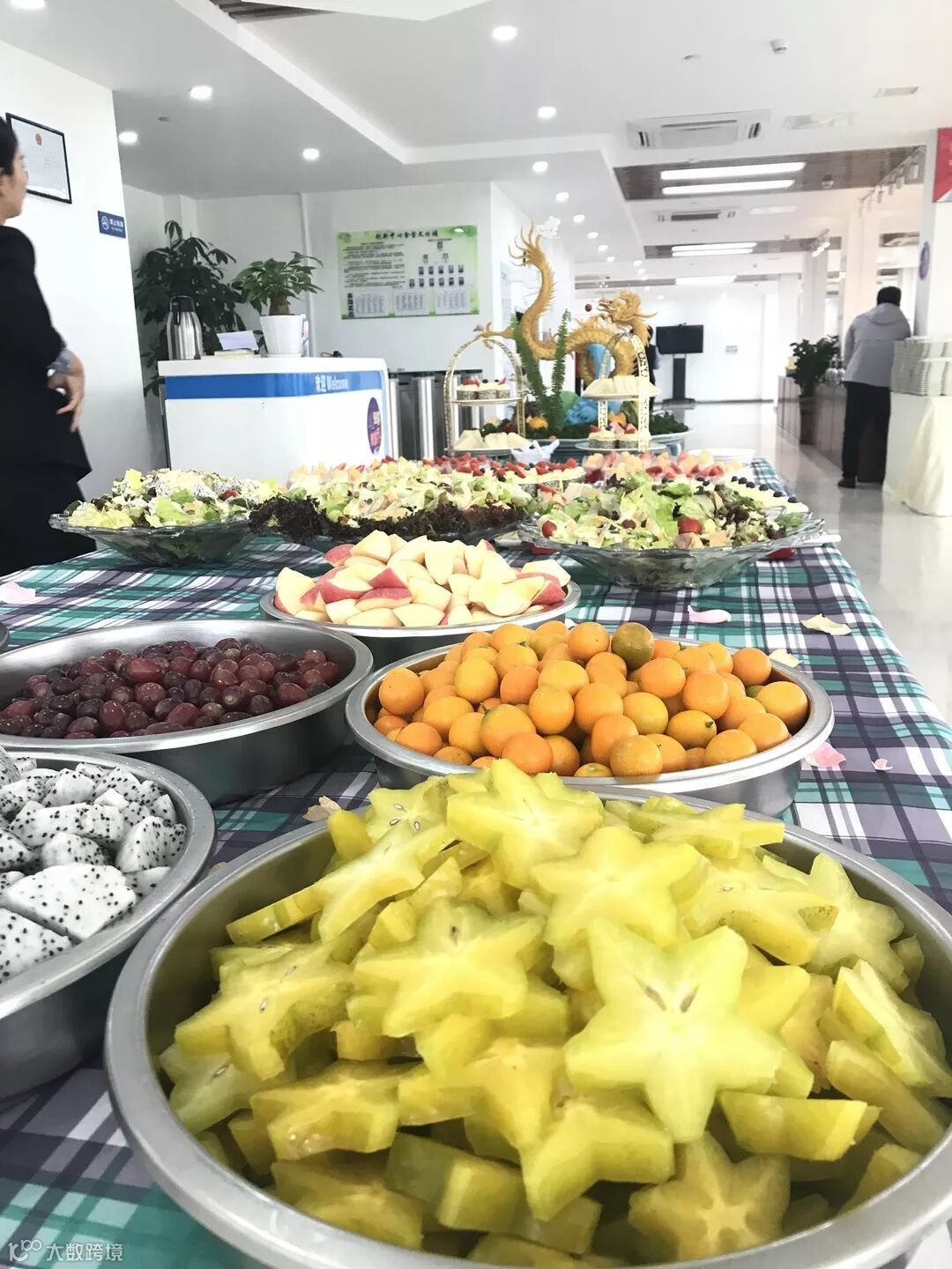 经过精心准备,美食节终于如火如荼地开幕了!除了餐线上准备的美食,大厅成了美食体验现场:水果区、甜点区,每个区域都非常火爆,好多小伙伴都在各个区域耐心排队,取了这个美食舍不得那个美食,只好各取一点,所以大部分小伙伴一个人用两到三个盘子和碗装美食,看着这一个个期盼的小眼神,足以可见美食的诱惑力有多大!