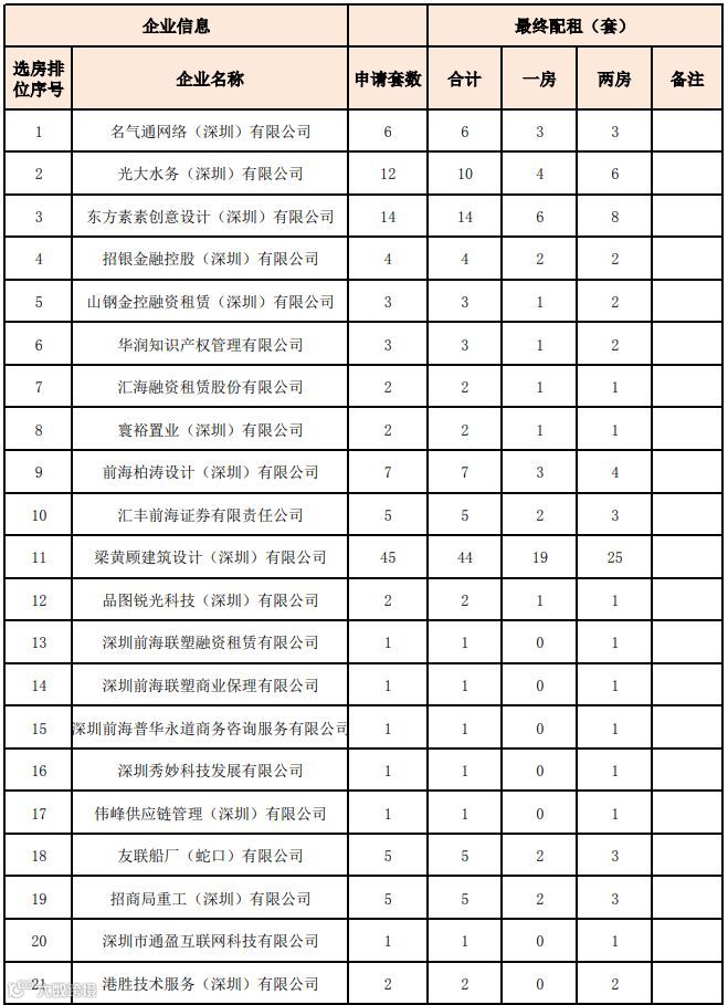10-12月份共审核21家港资企业、8家机关事业单位、8名高端人才和紧缺人才住房申请,均符合条件,企业名单和可分配住房配额、选房排位详见下图。