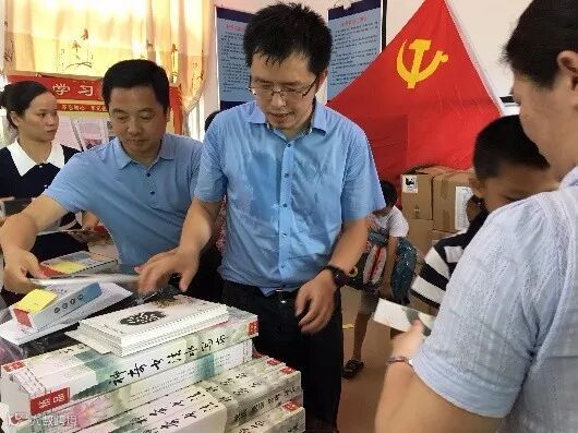 (上图,科控公司副总经理郭起宏、人力资源部部长谢永刚在给孩子颁发文具)