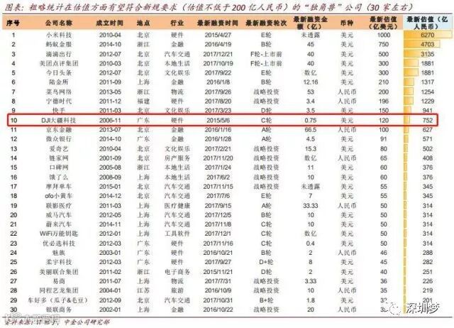 中金公司根据《证监会开展创新企业境内发行股票或存托凭证试点》的要求估测认为,符合试点要求的“独角兽”及“四新”红筹股约35家,其中大疆创新以120亿美元的估值排名第十。
