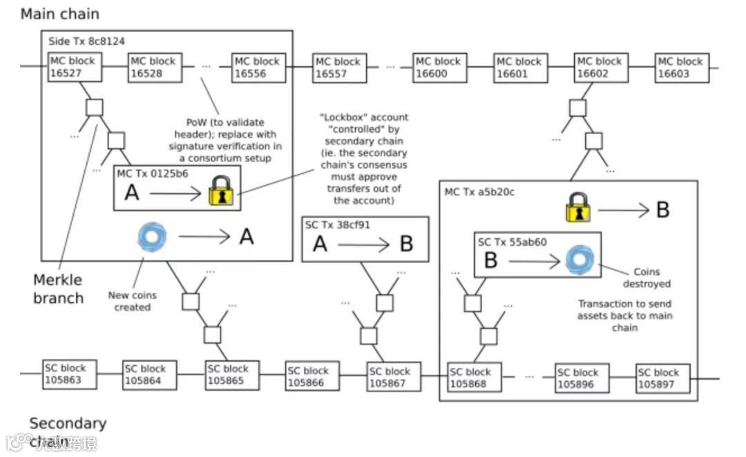 假设区块链拥有区块Header和Body,Header中拥有Merkle等证明信息,可以将链A的区块链头,写入链B的块中,链B使用和链A一样的共识验证方法,比如PoW验证难度和长度,PBFT验证投票等。等待链A的区块头序列之后,链B就可以通过Merkle分支的证明信息来证明链A的数据和操作。