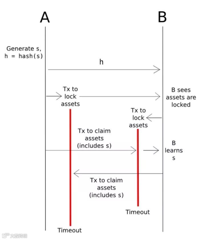哈希锁定模式的设计是希望链A与链B之间尽可能少的了解彼此,并作为消除公证人信任的手段,该模式的基本流程如下图7所示。