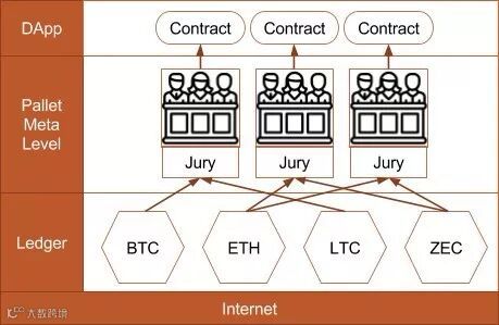 而Pallet是在做协议——多利益关联方的共识协议,所有的链都可以是参与方,不需要「链与链」之间的锚定。Pallet协议和体系不产生独立的链,而是采用陪审团制度随机选取陪审员,所有的陪审员节点再去对接各底层链实现存证,最大化利用现有的链和资源。