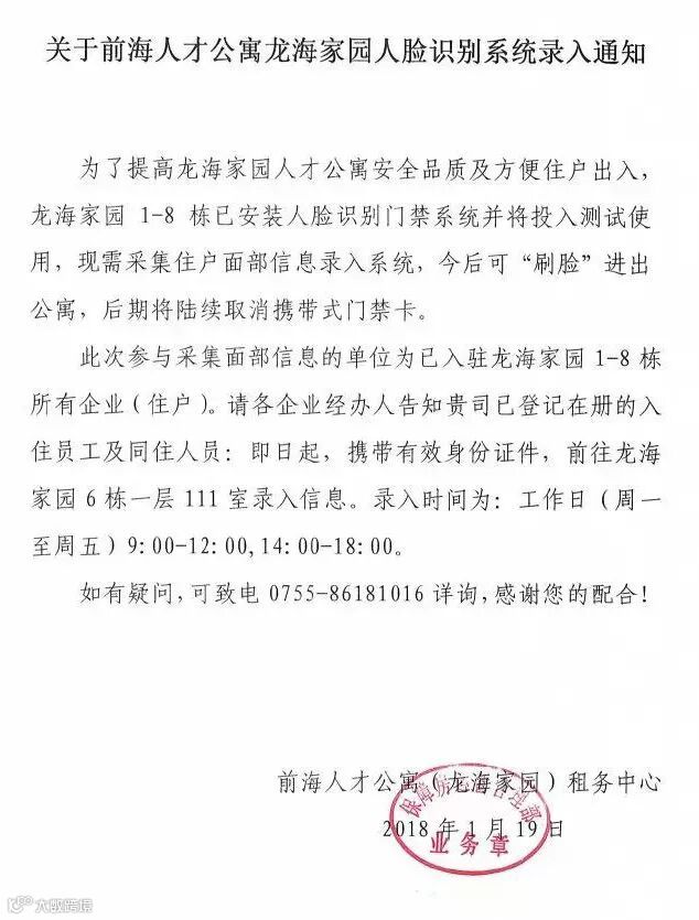 @龙海家园居民 | 前海人才公寓人脸识别系统录入通知