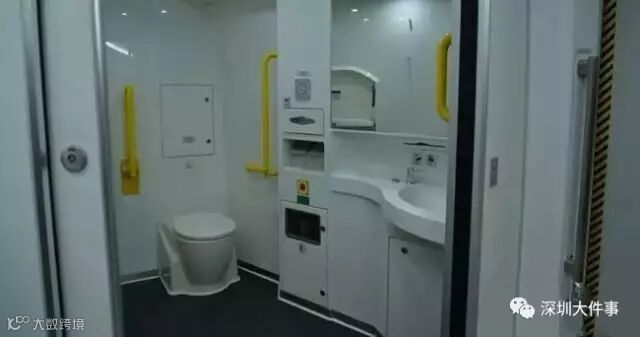 ▲车厢间的洗手间及饮水机。设有伤残人士专用厕所、婴儿护理台。每卡车厢均有大型行李摆放架,座位上方也设有行李放置架。