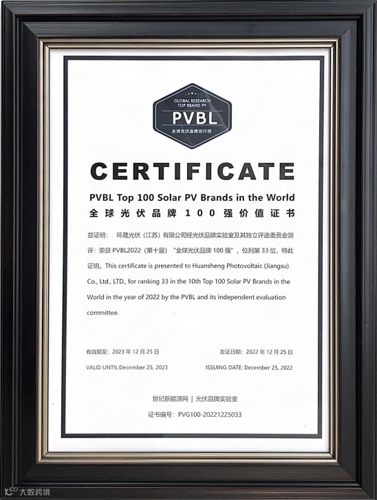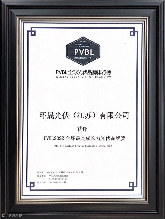 12月25日,由世纪新能源网、光伏品牌实验室(PVBL)联合主办的CPC2022第七届世纪光伏大会暨PVBL2022第十届全球光伏品牌榜发布会在上海隆重举行,PVBL2022“全球光伏品牌100强”榜单正式发布,环晟光伏凭借在光伏领域的优异表现和丰硕成果荣登榜单第33位。此外,在细分奖项榜单中,环晟光伏再次斩获PVBL2022全球最具成长力光伏品牌奖,品牌实力再获认可。
