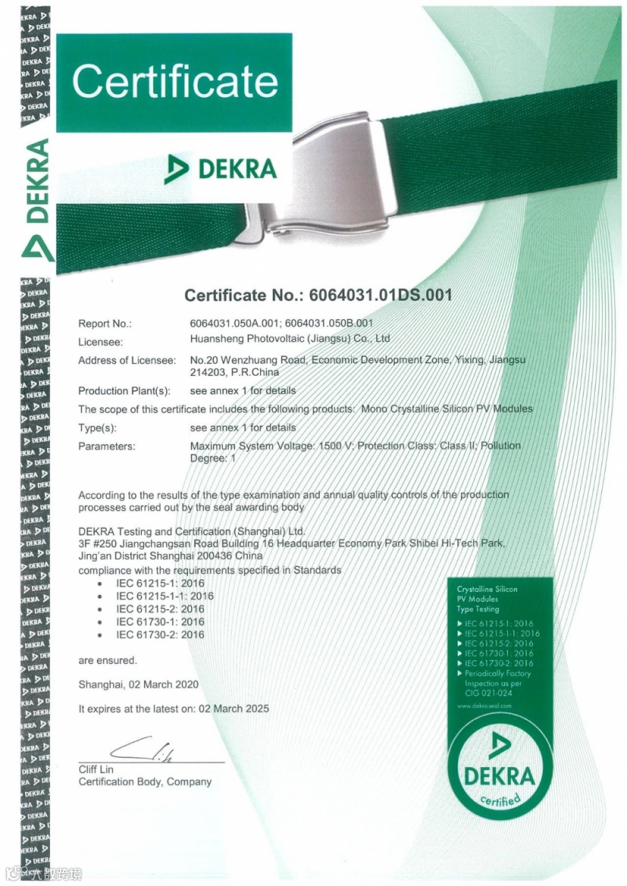 2020年4月3日,环晟光伏旗下单晶叠瓦系列组件荣获DEKRA Seal证书。是对公司高技术、高品质的肯定,为公司蓬勃发展打下坚实基础。