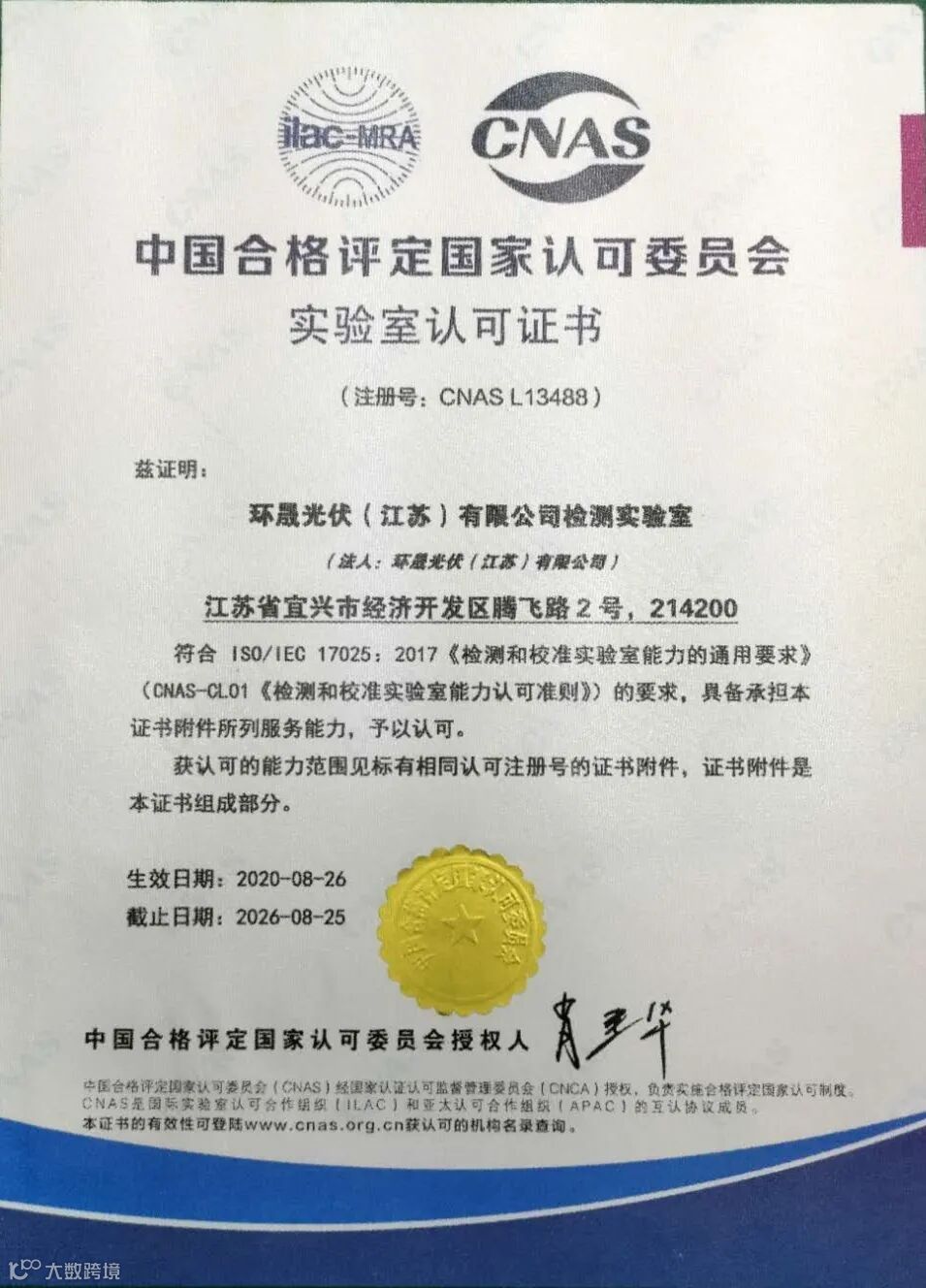 2020年08月26日,环晟光伏检测实验室通过中国合格评定认可委员会(CNAS)认可。
