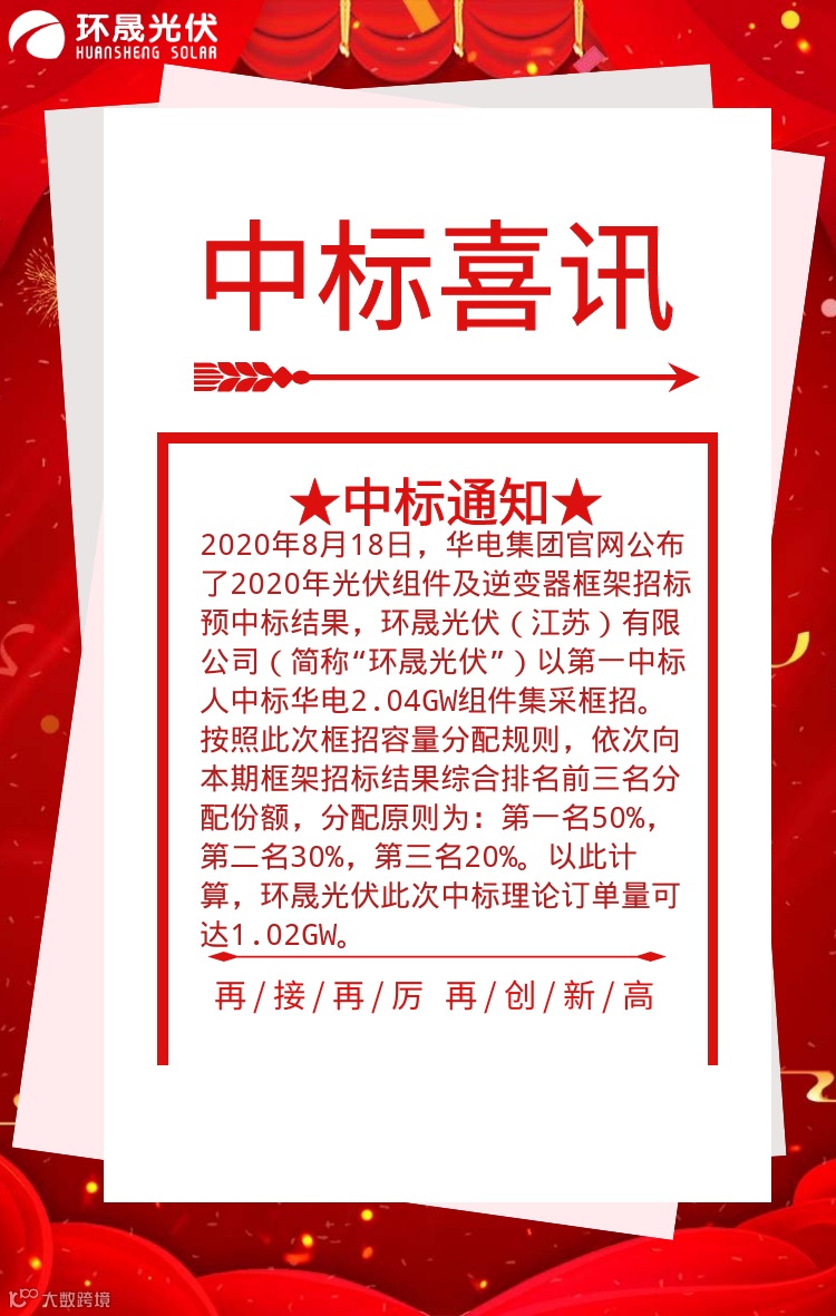 2020年8月18日,环晟光伏首个GW级订单,环晟光伏以第一中标人中标华电集团2.04GW集采框招。