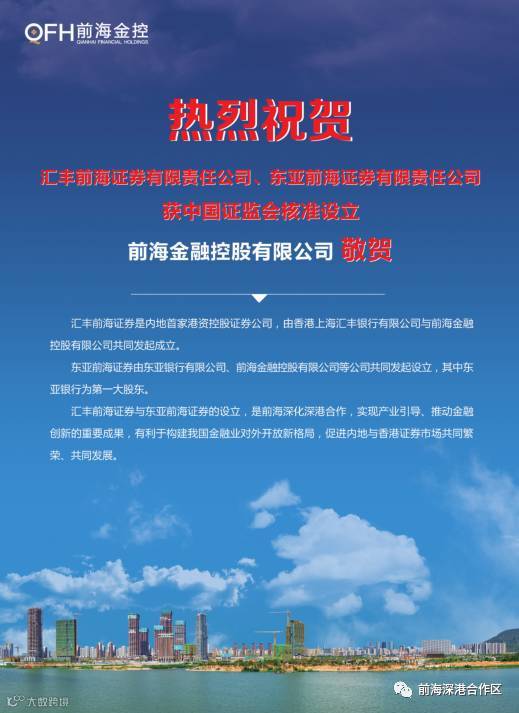 比如:汇丰前海证券有限责任公司和东亚前海证券有限责任公司在今年6月30日同时获中国证监会核准设立,即将在前海开业!