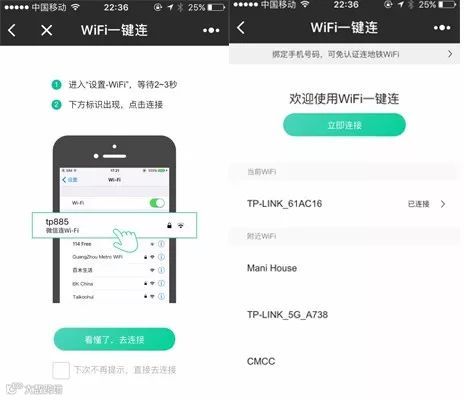 进入小程序后,点击「立即连接」,就会跳转到手机WiFi设置界面,那些标有「微信连WiFi」的就可以直接连接了。