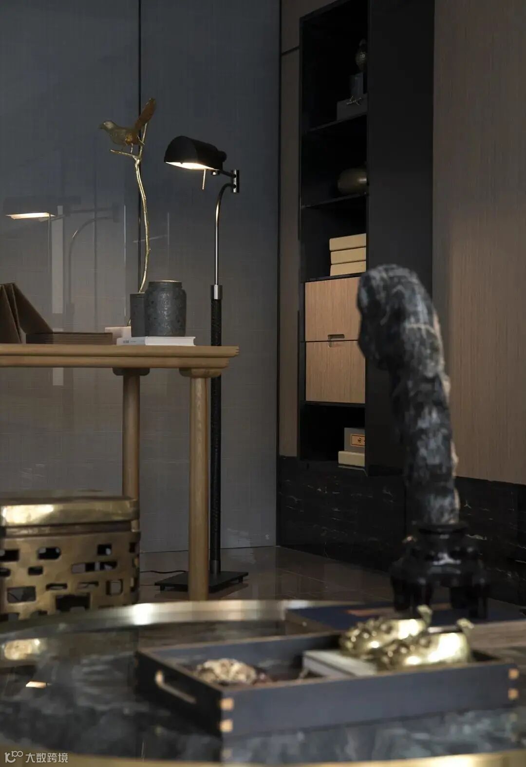 古色古香是中式的气韵,一卷一物的肌理与雅意,将千年的文化传承微缩于空间之中,一枝鸣啾啾盘活了一室的灵气,心远喧嚣地,情归最浓时。
