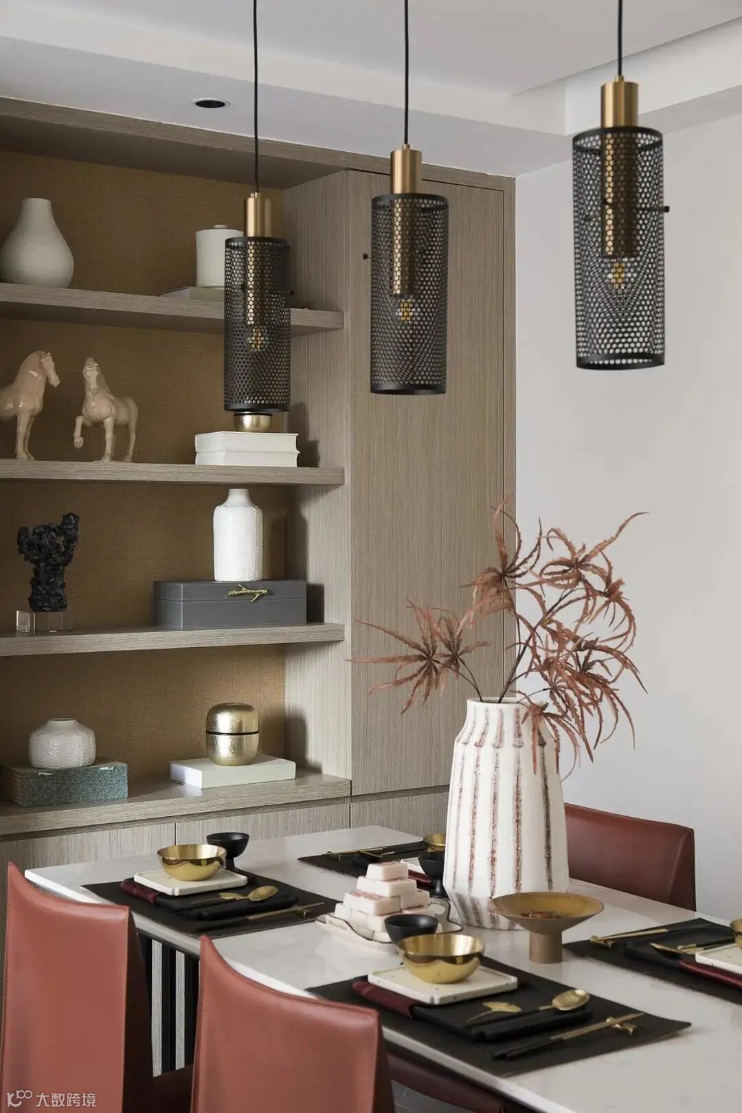 木质屏风是东方风情的标配,若隐若现之美对造境功不可没。中式的圆融与花鸟意境也被引入其中,成为设计附赠给生活的表达符号,更是深入国人骨髓的回归精神。