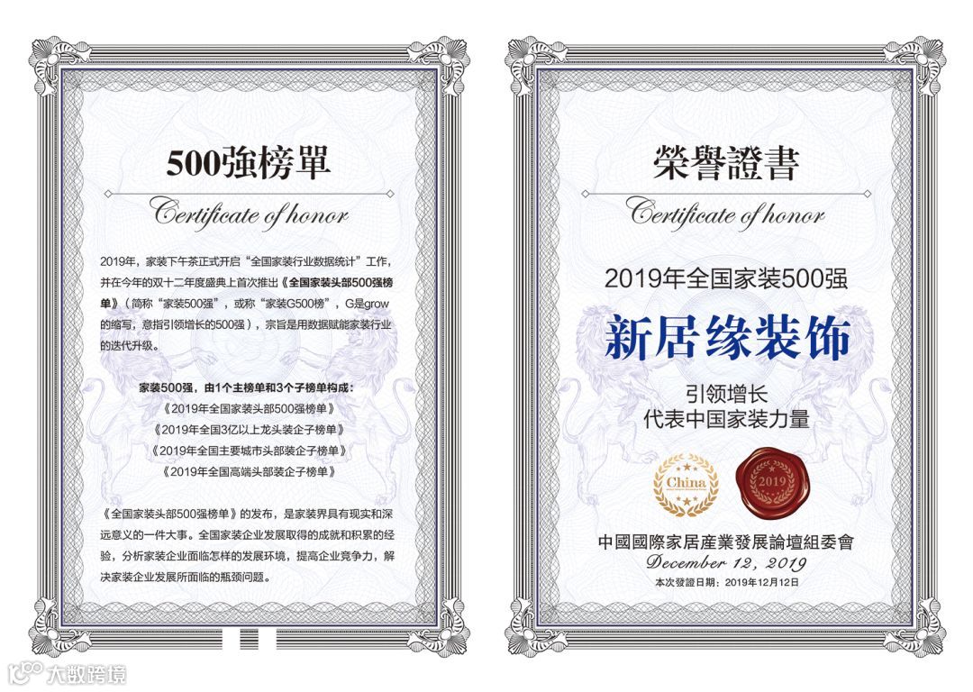 2019年12月12日,中国国际家居产业发展论坛——暨家装下午茶2019双十二泛家装年度盛典在上海举办。会议期间,全国家装头部500强榜单发榜仪式隆重揭幕,正式发布了《2019全国家装头部500强榜单》,并授予上榜证书。经综合评定,新居缘装饰荣登500强榜单!