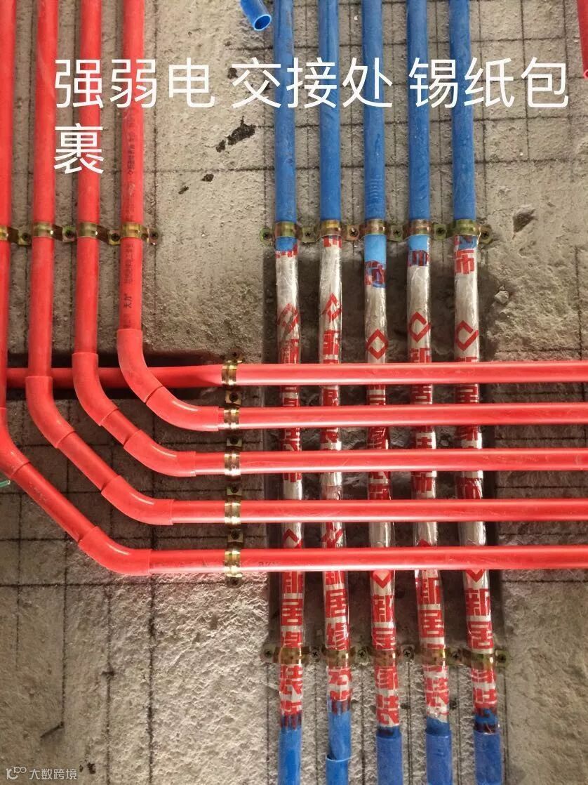 强弱电交叉用锡纸包缠线管对电磁信号进行屏蔽分离,使两者信号独立,避免相互干扰。