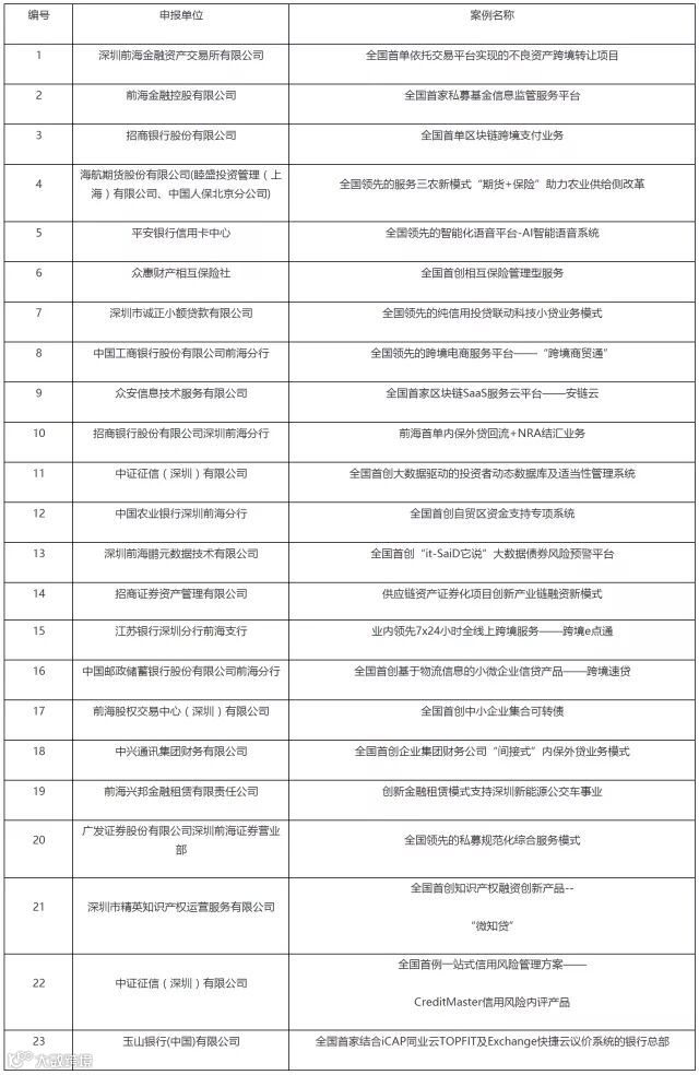 2017年度前海蛇口自贸片区优秀金融创新案例名单