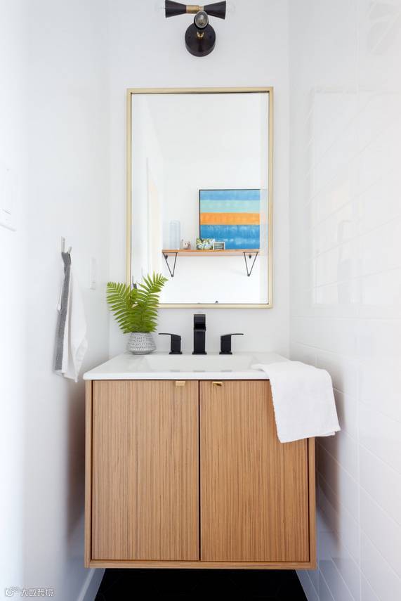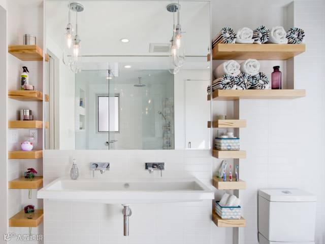 狭长的洗手间就更容易做开放式收纳柜了,洗手间一般都会有潮气,开放式收纳柜不容易滋生细菌。