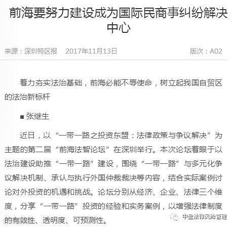 积极探索建立国际化、高水平、多元化的法律争议解决机制,大力推动“一带一路”国家和地区法律资源库建设,提升法律服务水平,是前海深港现代服务业合作区承担的特殊使命。着力夯实法治基础,前海必能不辱使命,树立起我国自贸区的法治新标杆。