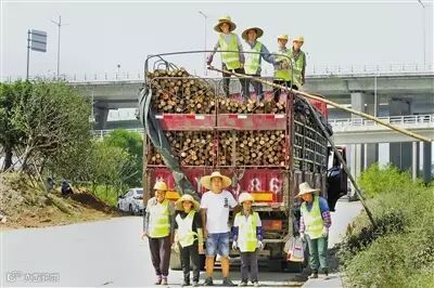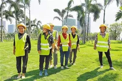 在伍淑杰享受冲凉房的凉爽的同时,一公里以外的另外一处工地上,来自贵州安顺的李双芳和其他工友正在铺设草坪, 约30公分长宽的正方形草皮不断地从车里运送下来,原本杂乱的黄色泥土工地在工人灵巧手指的装扮下,披上了绿色的新装。放眼望去,这些紧贴地面的小小植被,将钢筋结构的建筑衬托得蔚为壮观。