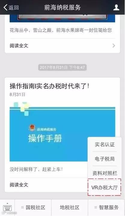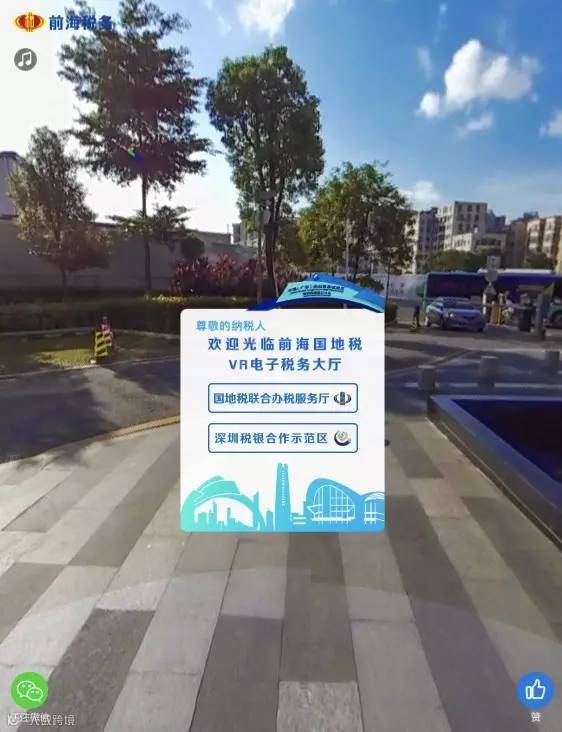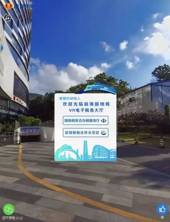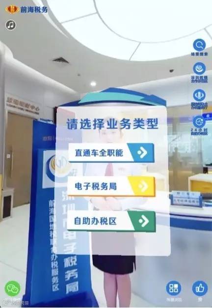 进入“前海纳税服务”公众号,点击功能菜单“智慧服务”—“VR办税大厅”
