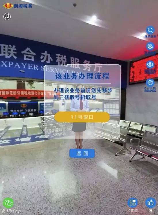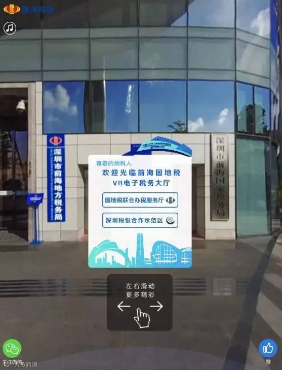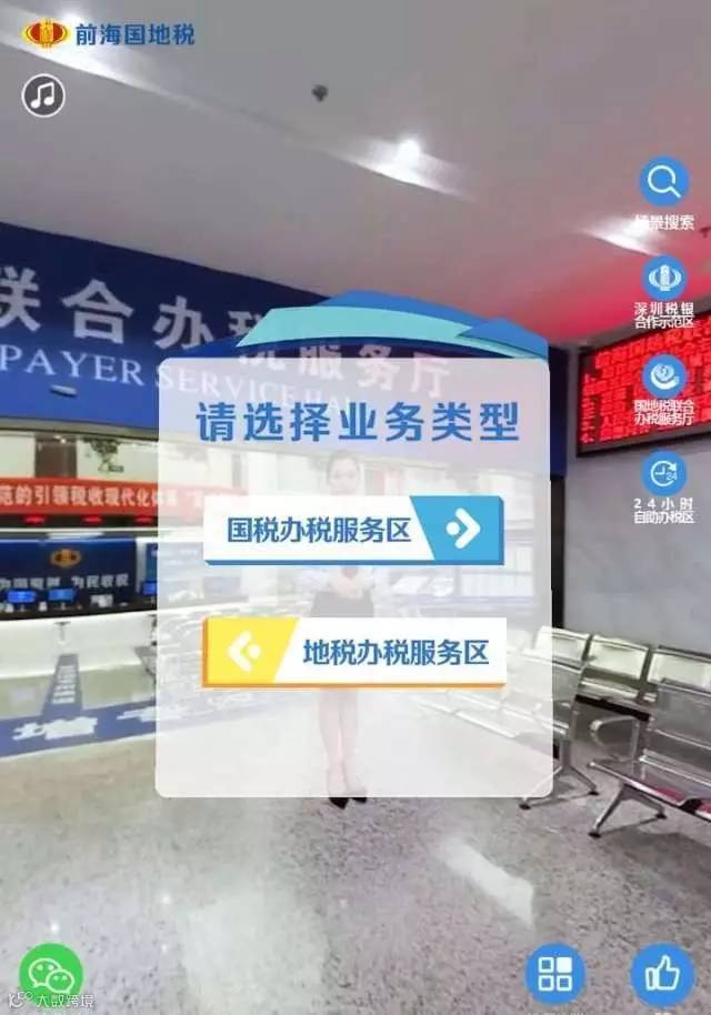 前海税务智慧VR办税厅是全国首个由国地税联合打造的可交互智慧虚拟现实办税厅,它将真实的前海国地税联合办税大厅及前海税银合作示范区动态化地呈现在屏幕中。
