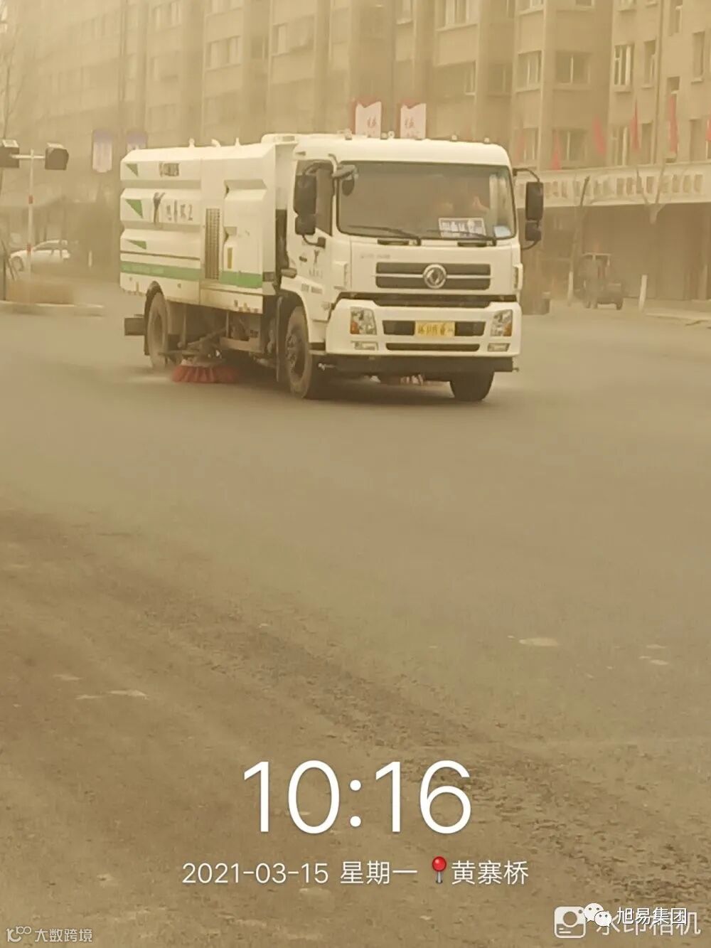 我们的旭易人不惧严寒不畏恶劣,坚持奋战在第一线,一大早,旭易各个项目部就启动全面布控模式,对道路卫生情况和设施运行情况以及重点路段进行强力作战。全体旭易人在沙尘大、视线模糊、呼吸困难的情况下,克服重重困难,坚持一线清扫保洁,严守重点路段、事故易发路段,确保不会因为沙尘天气而降低市民的出行安全。同时,加大对国省道、城区道路的除尘力度,通过湿扫车、干扫车、洒水车等等大型机械的高强度工作,尽量保持道路整洁、空气质量提升!