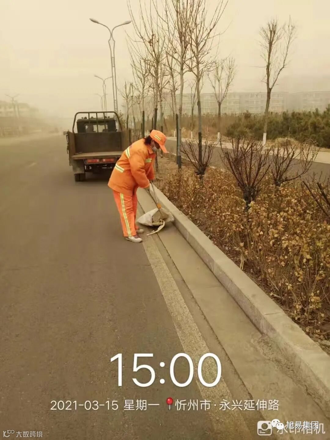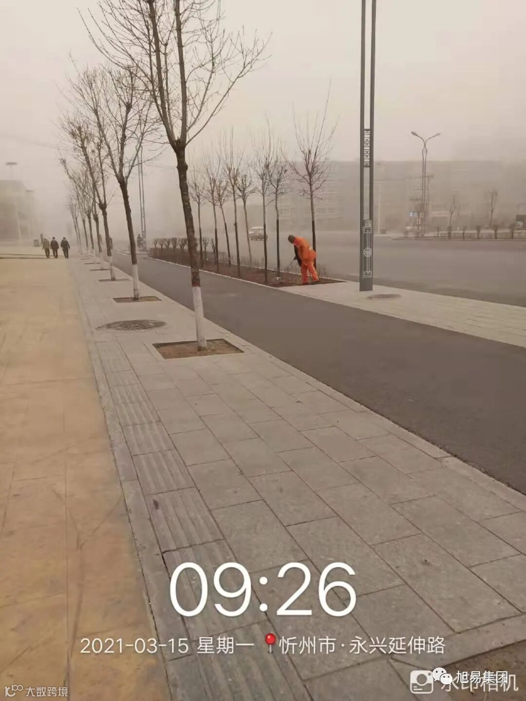 昨日,山西省遭遇近10年来范围最大、强度最强的沙尘天气,致使道路能见度降低,卫生环境恶劣,给大家出行带来了极大隐患。旭易集团各个项目部迅速启动应急预案,积极采取有效措施,坚守工作岗位,加强人力物力,全力做好恶劣天气下的环境卫生保洁工作,确保所有道路干净整洁,最大限度减小沙尘天气对辖区环境卫生带来的不利影响,为广大人民群众的健康创造良好的环境。