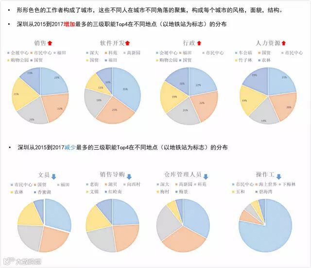 城市是多样的,这个多样归根到底是人的多样。从劳动者的结构上看,深圳在过去的三年中,销售、软件开发、行政和人力资源类的就职人口增加迅速,国贸、会展中心、高新园等地铁站点的职能变化速度较快。相对应的,文员、销售导购、仓库管理人员、操作工等相对低端的职能,则正在从深圳消失。
