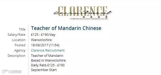 编在招聘网站Clarence发现,英国华威郡一所机构为招募普通话教师,开出了125-190英镑的日薪,并且薪水每日结账。按此计算,一位中文老师每天最高可以挣到约合人民币1625元的工资!