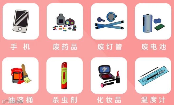 有害垃圾:包括电池、荧光灯管、灯泡、水银温度计、油漆桶、部分家电、过期药品及其容器、过期化妆品等。这些垃圾一般使用单独回收或特殊处理。记住口诀“汞灯药(汞、灯、药)、池漆(池、漆)”。