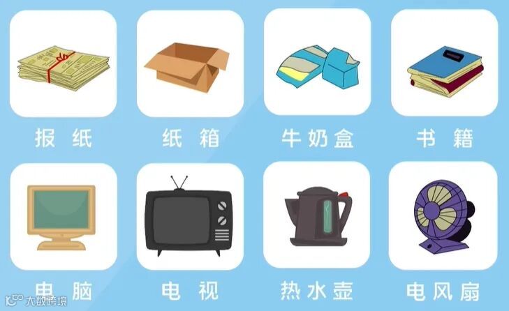 废纸:主要包括报纸、期刊、图书、各种包装纸等。(注意纸巾和厕所纸由于水溶性太强不可回收)