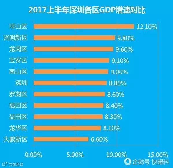 而在增速方面,全市为8.8%,共有5各区超过全市平均增距,其中今年正式成为行政区的坪山以12.1%的GDP增速排名深圳第一,光明新区9.8%、龙岗区9.6%紧随其后。 (来自:快曝料)
