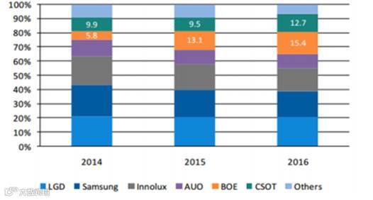 到今天,大陆液晶面板已经占全球出货量30%以上,逼韩国超日台。