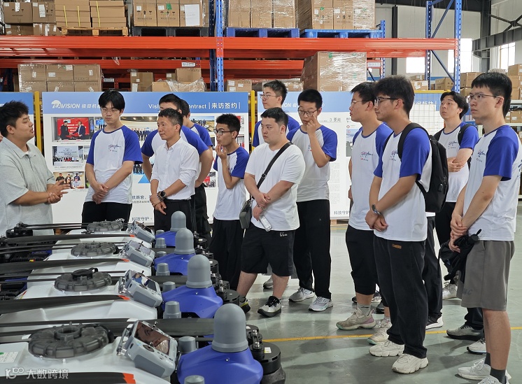 ,为学生分享警用无人机的应用案例。随后,学生来到氢鹏科技生产车间,实地观摩氢动力无人机的整机组装调试,并由企业负责人向学生介绍氢无人机在各类场景中的应用。活动第二站位于万丰航空小镇,学生参观了万丰航空的机库和飞行保障平台。最后,学生们走进极目机器人,参观植保无人机喷洒农药的场景。