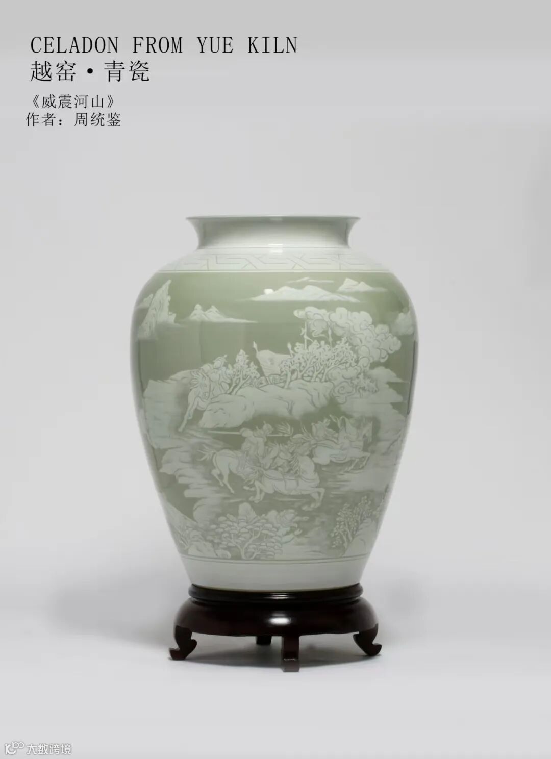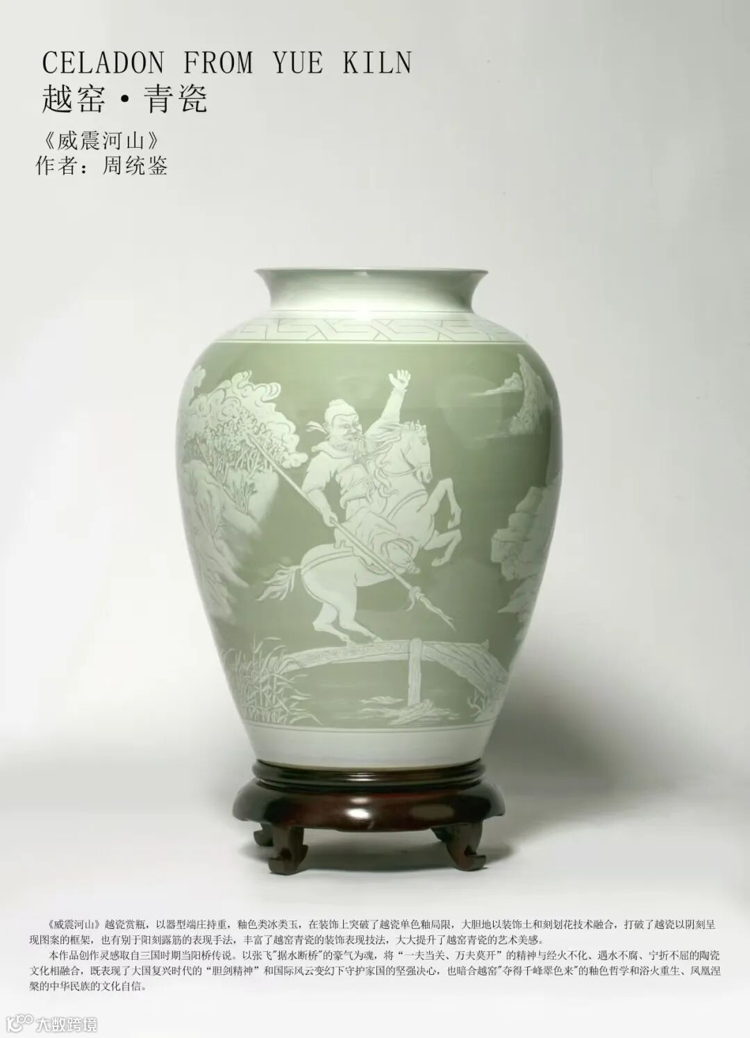 《威震河山》越瓷赏瓶,器型端庄持重,釉色类冰类玉,在装饰上突破了越瓷单色釉局限,大胆地以装饰土和刻划花技术融合,打破了越瓷以阴刻呈现图案的框架,也有别于阳刻露筋的表现手法,丰富了越窑青瓷的装饰表现技法,大大提升了越窑青瓷的艺术美感。本作品创作灵感取自三国时期当阳桥传说。以张飞"据水断桥"的豪气为魂,将“一夫当关、万夫莫开”的精神与经火不化、遇水不腐、宁折不屈的陶瓷文化相融合,既表现了大国复兴时代的“胆剑精神”和国际风云变幻下守护家国的坚强决心,也暗合越窑"夺得千峰翠色来"的釉色哲学和浴火重生、凤凰涅槃的中华民族的文化自信。