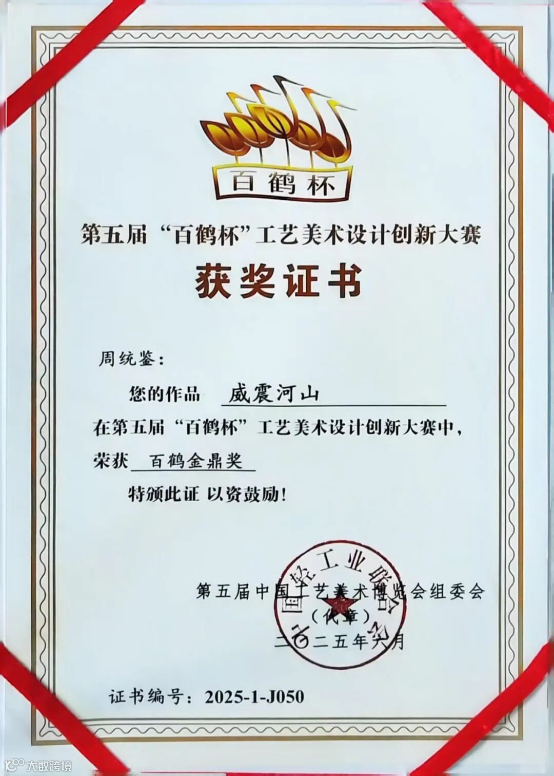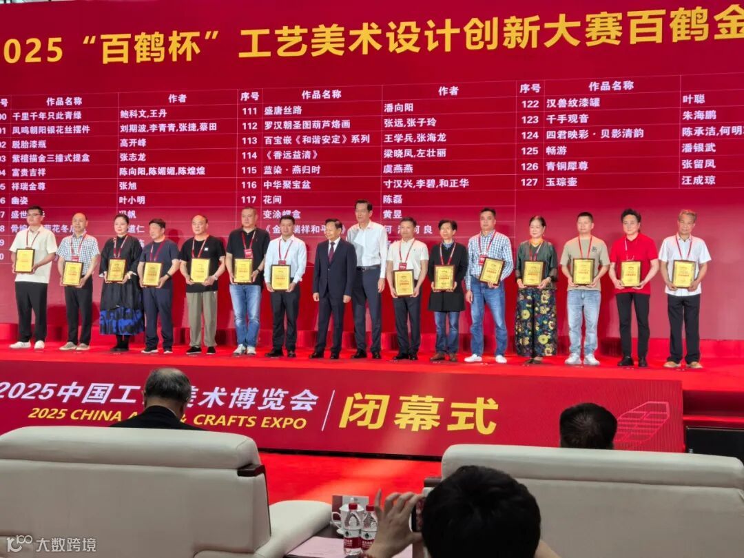 5月30日-6月2日,第五届中国工艺美术博览会(CACE2025)在福州海峡国际会展中心开展,浙江省工艺美术大师、越青堂董事长周统鉴创作的越窑作品《威震河山》赏瓶荣获本次“百鹤杯”工艺美术设计创新大赛最高奖“百鹤金鼎奖”,这是继前年周大师荣获该大赛“百花奖”、去年荣获该大赛“百鹤奖”以来的又一个更高级别的全国奖!