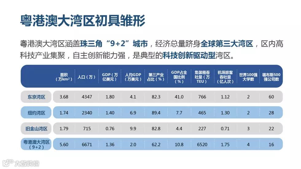樊纲认为,与世界知名的纽约湾区、东京湾区、旧金山湾区以及新加坡湾区相比,粤港澳大湾区的面积最大、人口最多,但GDP总量仍低于东京湾区和纽约湾区。