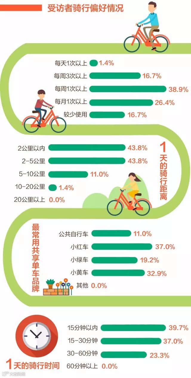 可见,小伙伴们更偏好每周骑行1次以上,每天骑行距离在5公里以内或者每天骑行时间在半小时以内。因此,如果大家的活动半径是5公里左右,共享单车是一个不错的选择哦~