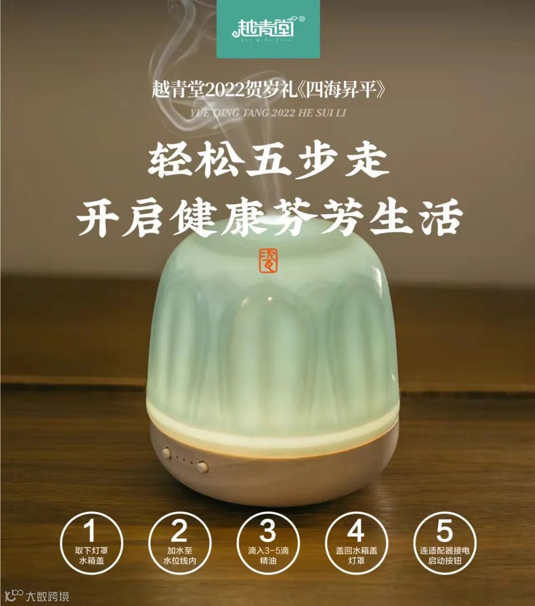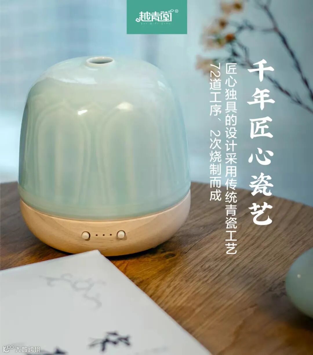 《四季清风》香薰灯,由传统青瓷工艺经过72道工序,两次烧制而成,采用三炼土制成香薰罩,香薰罩以莲花为造型,温润通透,顶部留孔出香氛。底座以进口实木和电子元件为材料,组合起来气质典雅、圆润自然。