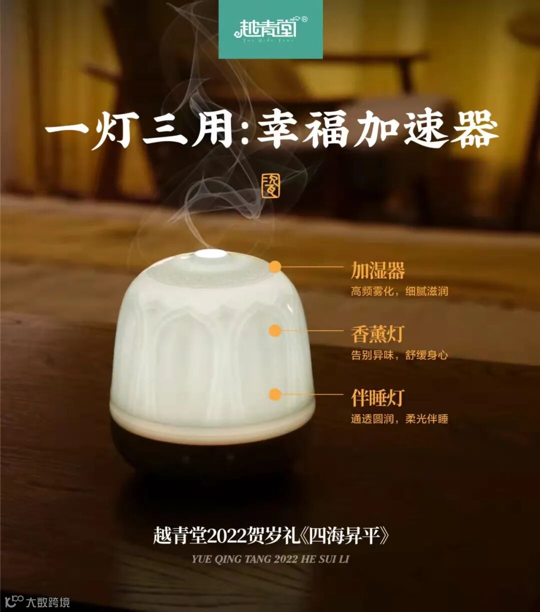 本香薰灯,既可作一款加湿器,也可搭配精油作香氛器,还可作为晚上起夜时的小夜灯,光泽温润柔和。它具有三档亮度调节和三档定时调节功能,并能在水分蒸发完后自动断电,安全可靠。