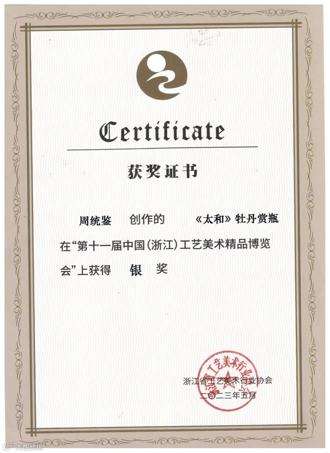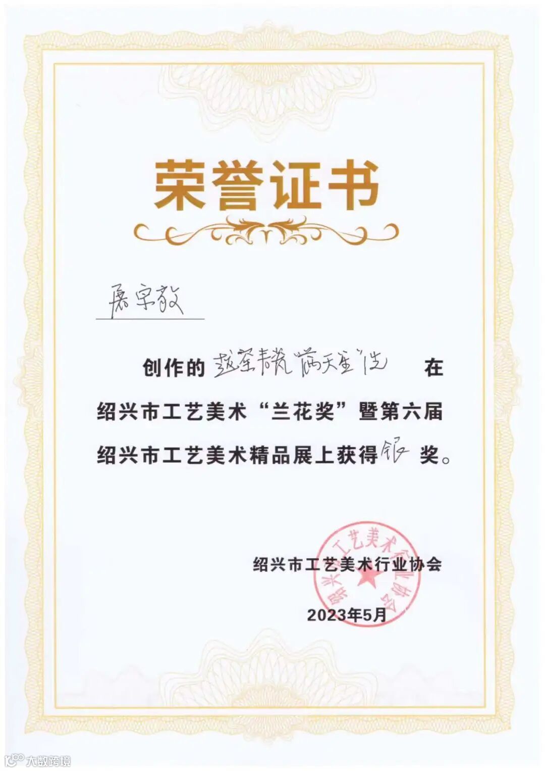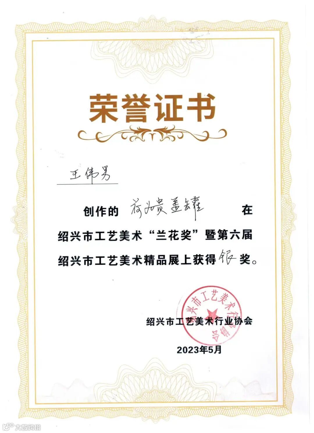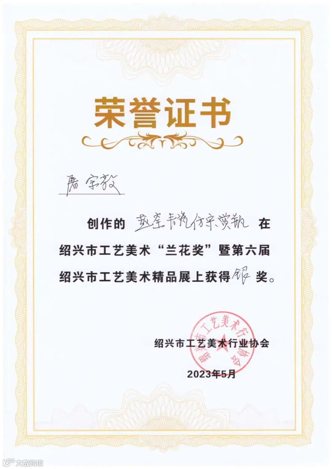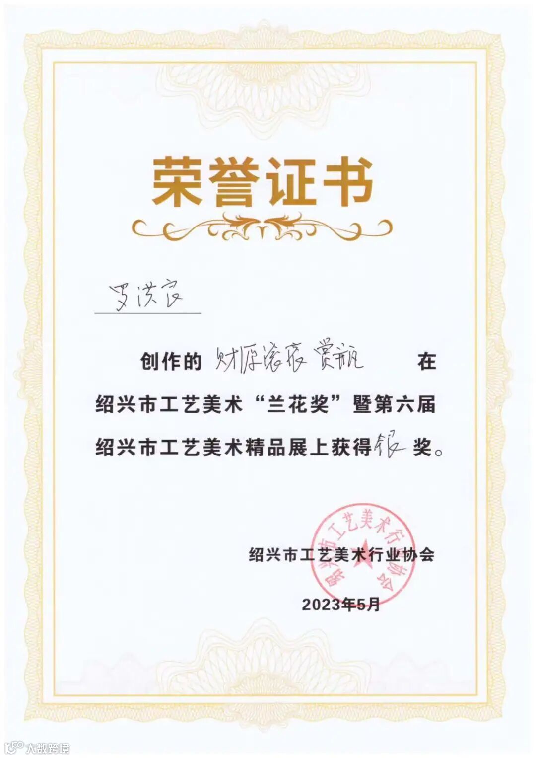 在“兰花奖”暨第六届绍兴市工艺美术精品展上获得银奖