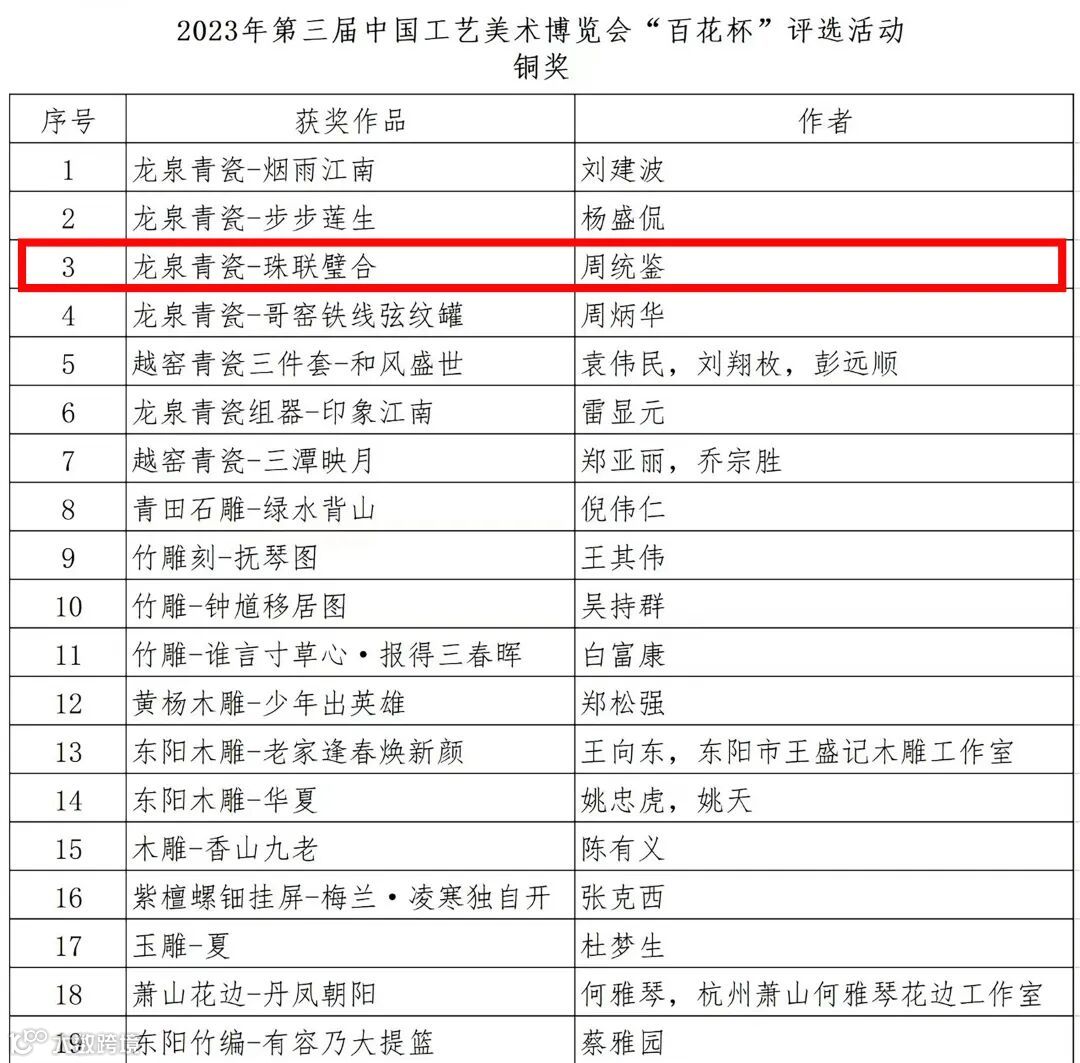这第三个好消息依旧来自于周统鉴大师,在5月29日南京国际博览中心举办的2023第三届中国工艺美术博览会上,周统鉴大师的作品《珠联璧合》荣获2023年第三届中国工艺美术博览会“百花杯”评选活动的铜奖。