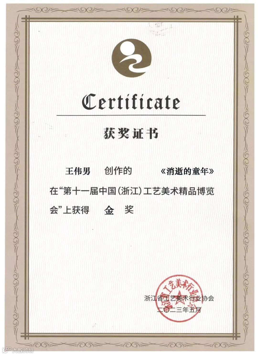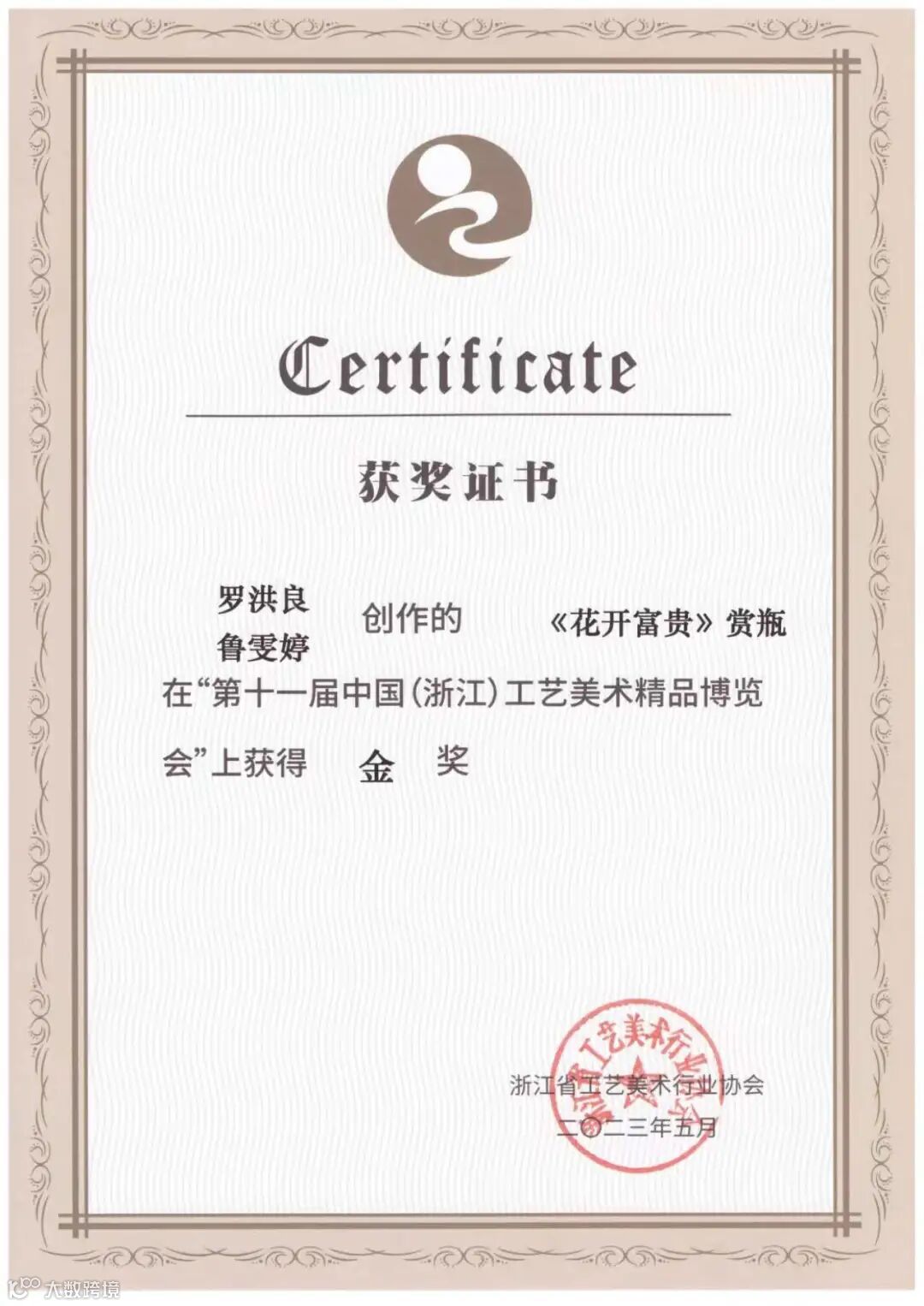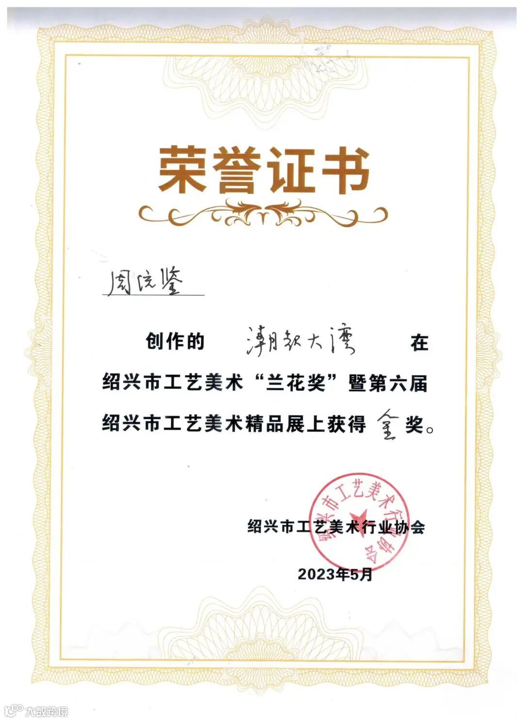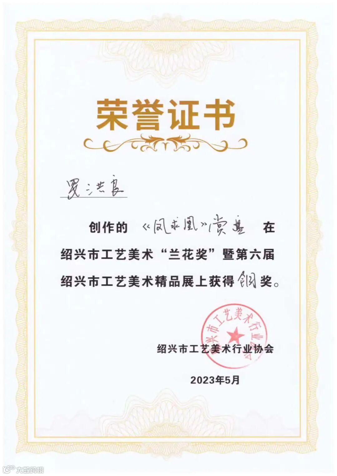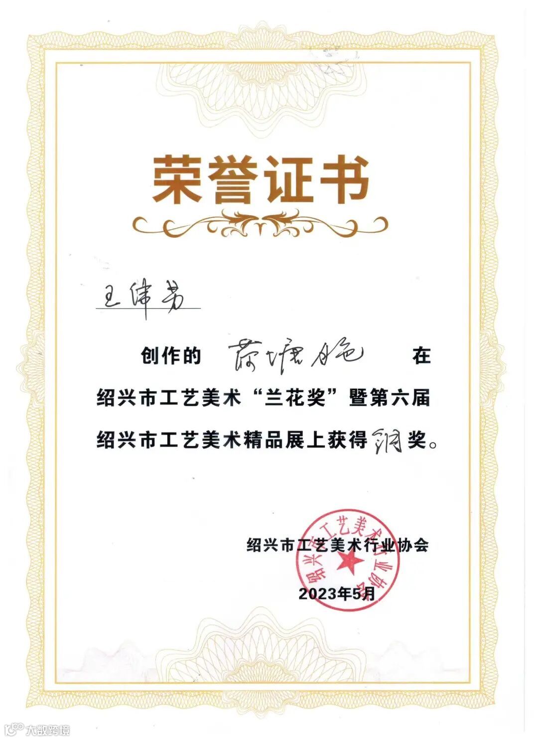 在“兰花奖”暨第六届绍兴市工艺美术精品展上获得金奖