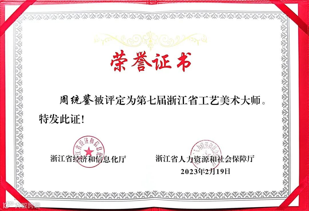 在此次工艺美术精品博览会上,还举行了第七届浙江省工艺美术大师颁证大会,值得我们骄傲的是,我们的周统鉴董事长被正式授予浙江省工艺美术大师的称号。