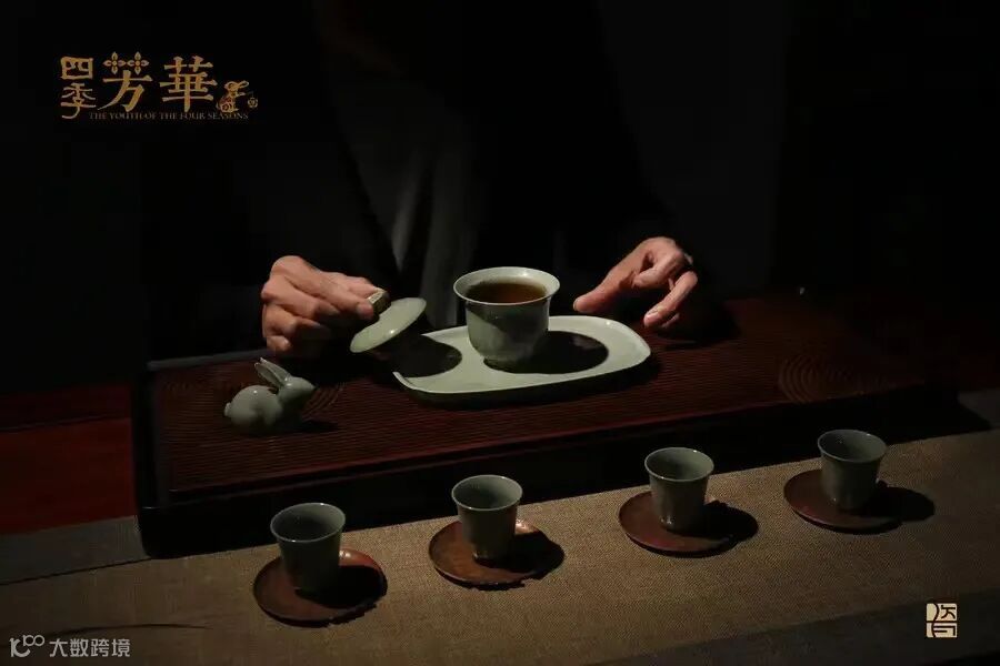 以茶器中的上品越窑盖碗作为贺岁礼的主体,表达了敬意和四季发财的寓意。