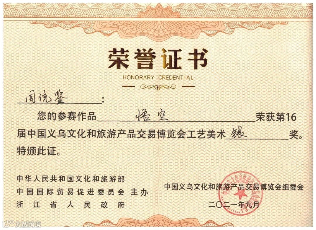 9月25日—27日,在由文化和旅游部、中国国际贸易促进会、浙江省人民政府联合主办的第16届中国义务文化和旅游产品交易博览会上,周统鉴的青瓷作品《悟空》再次获得博览会工艺美术银奖。