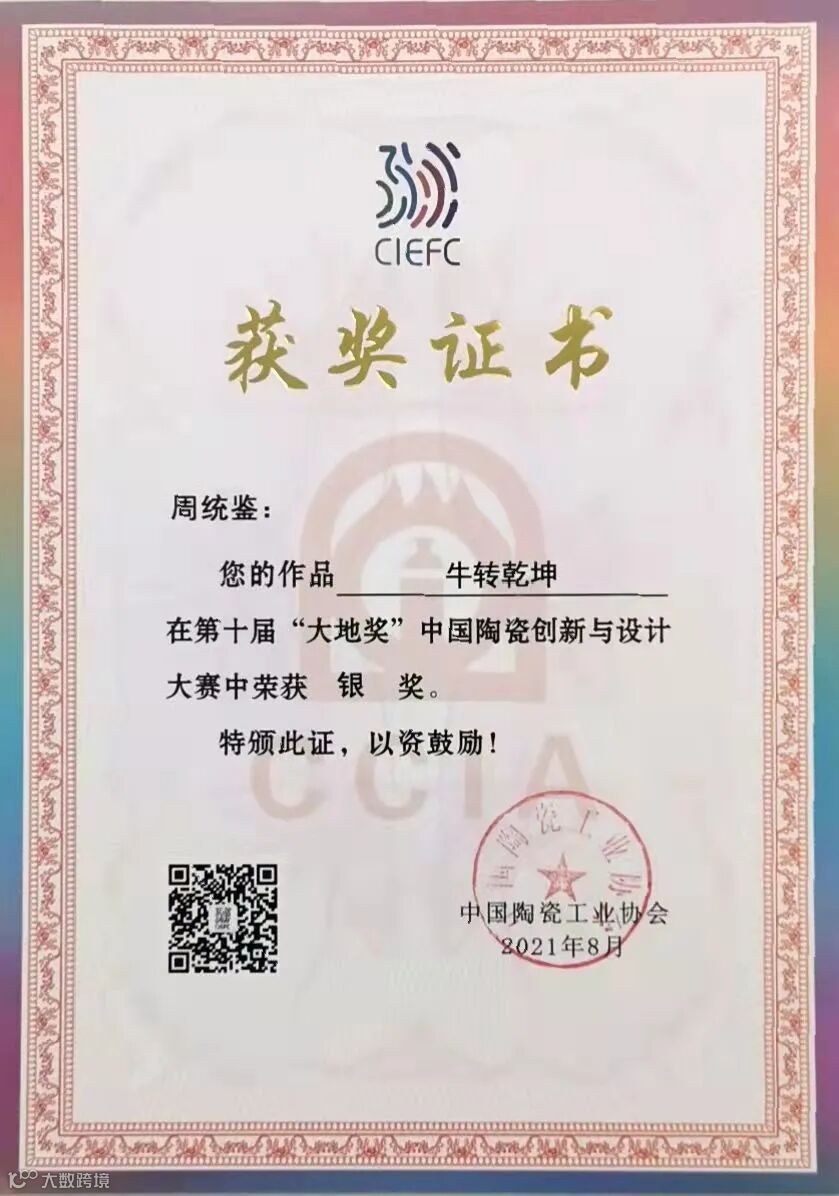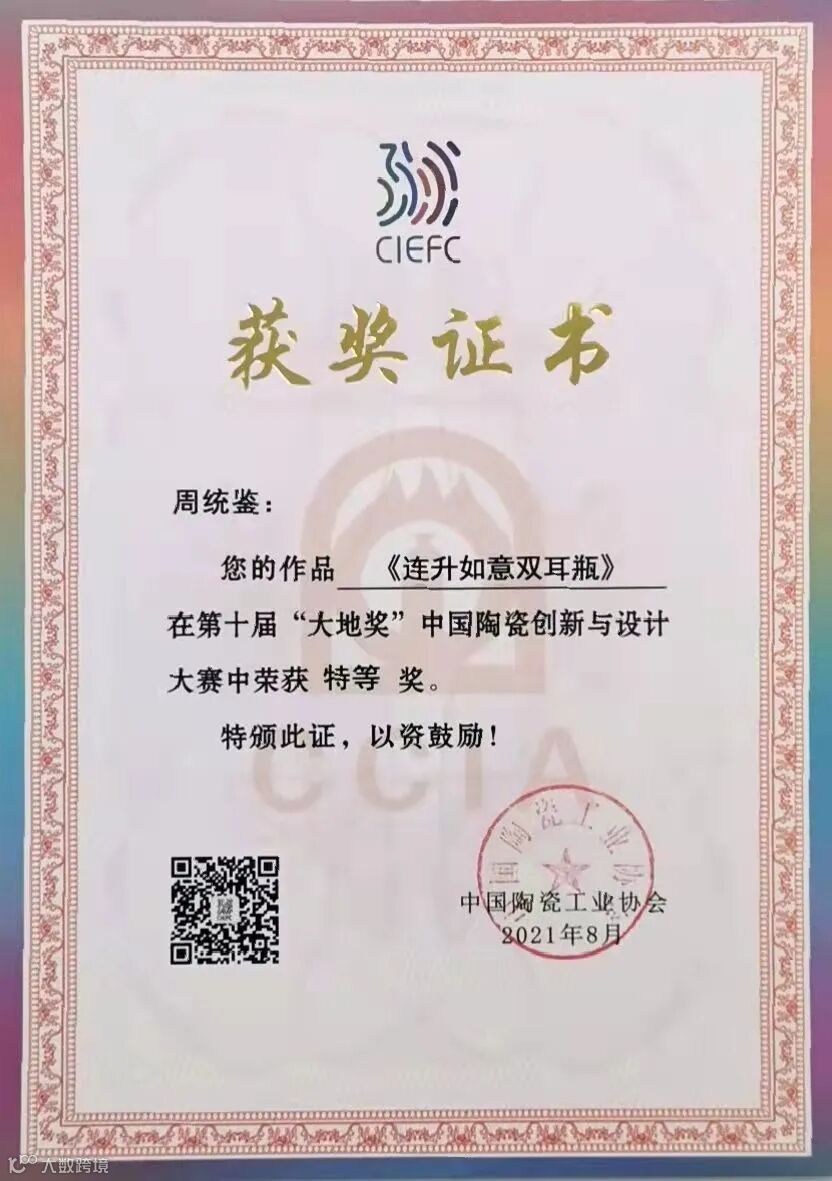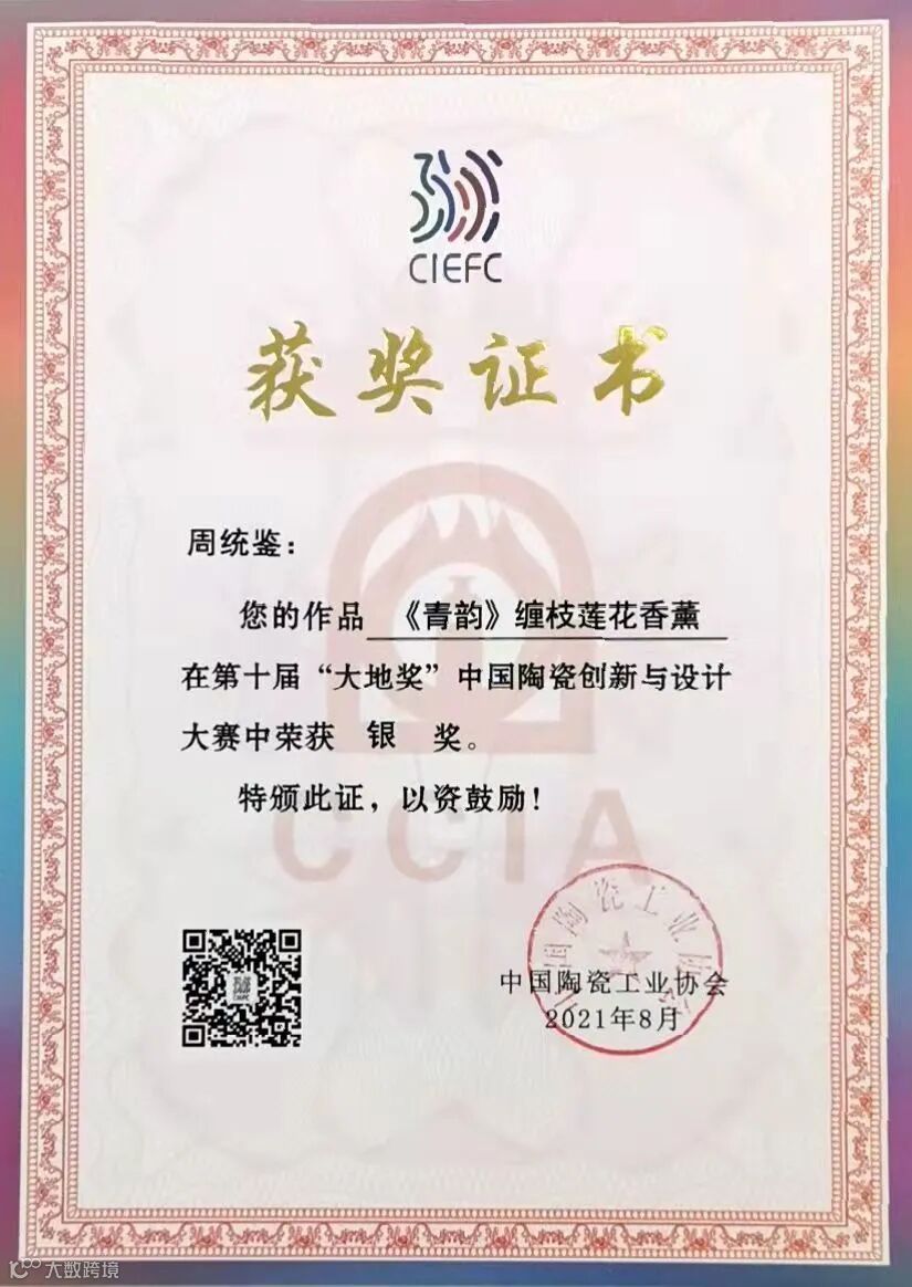 在展会举行的第十届“大地奖”中国陶瓷创新与设计大赛中,浙江越青堂首席设计师周统鉴参展的三件作品全部获奖,其中,《连升如意双耳瓶》荣获特等奖,《牛转乾坤》、《<青韵>缠枝莲花香薰》分获银奖。