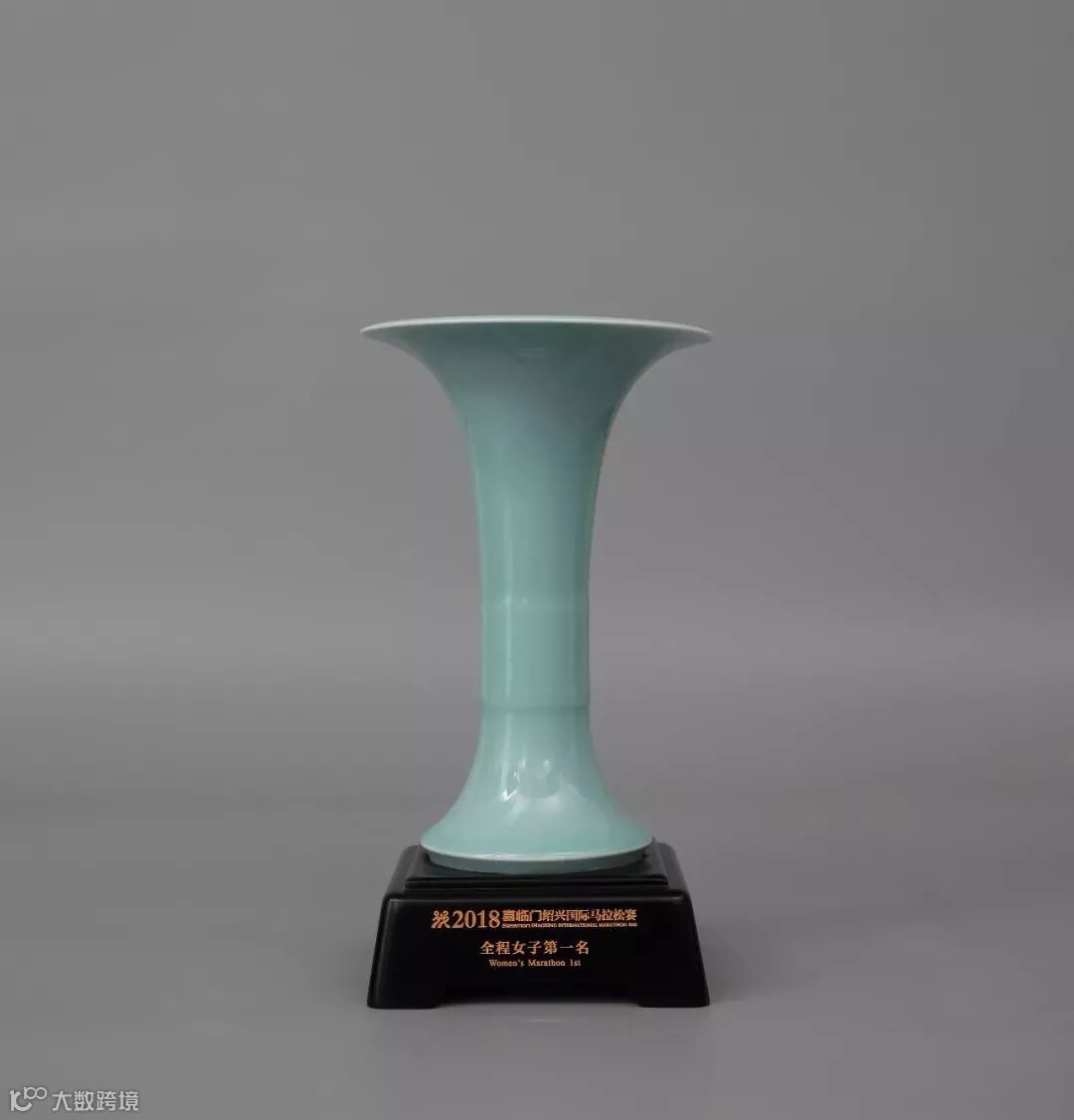 这款奖杯以宋代花觚(gū)造型为灵感,结合现代审美与古代青瓷烧制技术,设计了两种颜色及尺寸。以梅子青/粉青,区分男/女;以大/小区分全程/半程。奖杯造型简约流畅,釉面玉般温润,寓意承载使命、积极向上。